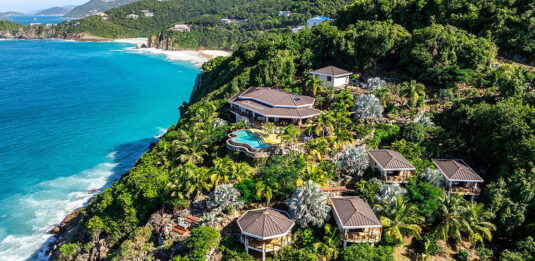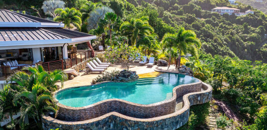 Nestled in the lush tropical gardens over 100 feet above sea level, this unique and totally private villa is situated on prestigious Steele Point, an exceptional private and gated peninsula estate which crowns Tortola’s West End. Gestalt’s charm begins to work its magic as you enter via the stone walkway through a flowering garden courtyard surrounded by lofty palm trees. This home features open-air Mediterranean architecture which showcases living and dining areas on two levels, where elegant furnishings lend a stylish, tropical air, and where shady seclusion looks out to verdant plantings and serene ocean views. Gestalt is alluringly decorated in sea and sky blues and white with cheery yellow accents throughout.