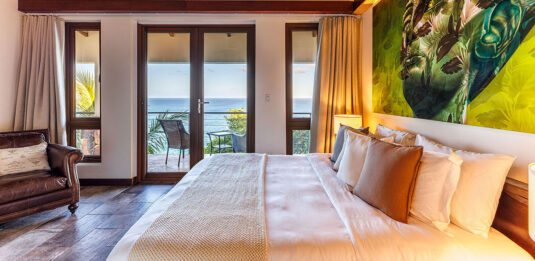The bedroom wing offers four air-conditioned bedrooms and four and one-half baths each with a private outdoor shower overlooking gardens and the tranquil ocean. A private path leads down to Gestalt’s own oceanside dock for diving and snorkeling.