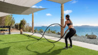 For those who prefer fresh air, the shaded outdoor section has a full set of Rouge weights, 2 bars with a full set of plates and a bench, pull-up bar, wall ball target, jump box and battle ropes. Plus a refreshing outdoor shower and a cold plunge.