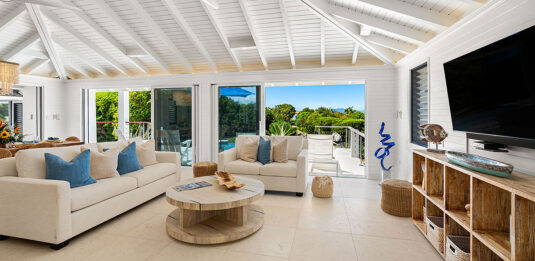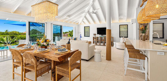 Three pavilions make up this outstanding villa: the main pavilion houses a well-equipped kitchen with professional appliances, central island and seating, along with indoor dining option. Bi-fold doors to two walls fold back fully, making the most of the incredible ocean views and good breezes. Enjoy al fresco dining just on the covered deck. In a separate building on the other side of the private pool is the air-conditioned entertainment room with large windows, which has a TV as well as wii games. The comfortable pull out couch converts to a queen bed, if required.
